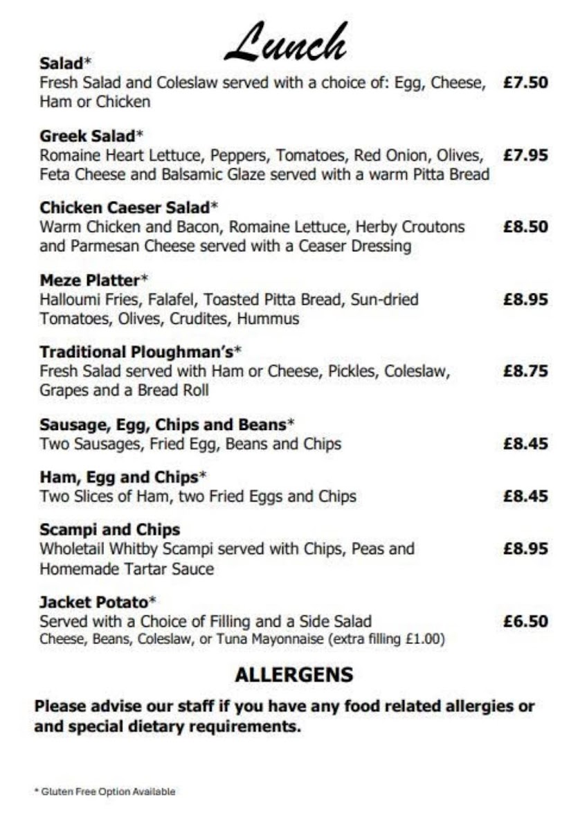 - Salads and Light Lunches: Fresh salads are available with choices such as Egg, Cheese, Ham, or Chicken, alongside specific options like Greek Salad served with warm pitta bread, Chicken Caesar Salad with bacon and dressing, and a Meze Platter.