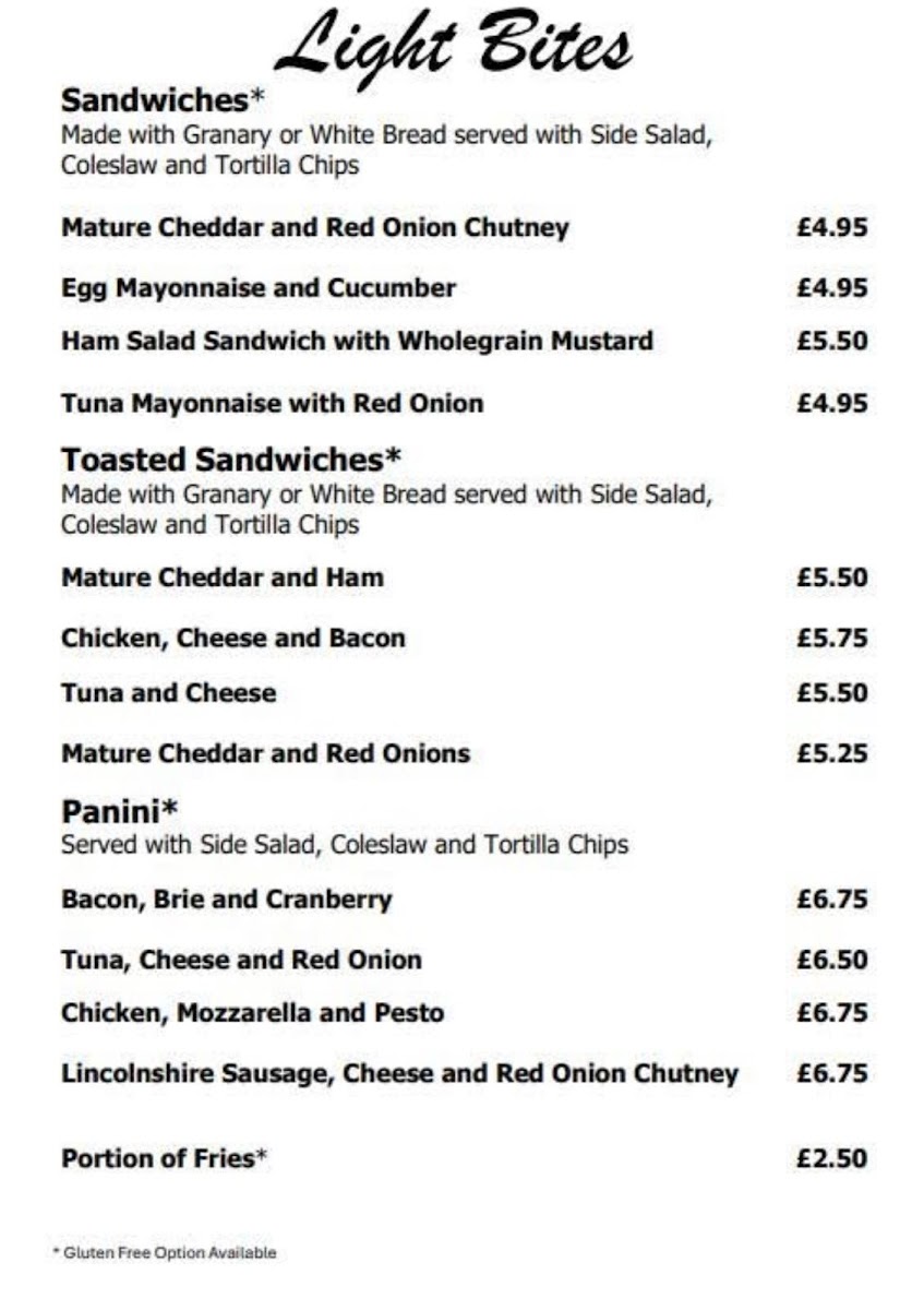 - Toasted Sandwiches: A range of sandwiches made with granary or white bread, including varieties like Mature Cheddar and Ham, Chicken, Cheese and Bacon, Tuna and Cheese, and Mature Cheddar with Red Onions. These are served with a side salad, coleslaw, and tortilla chips.